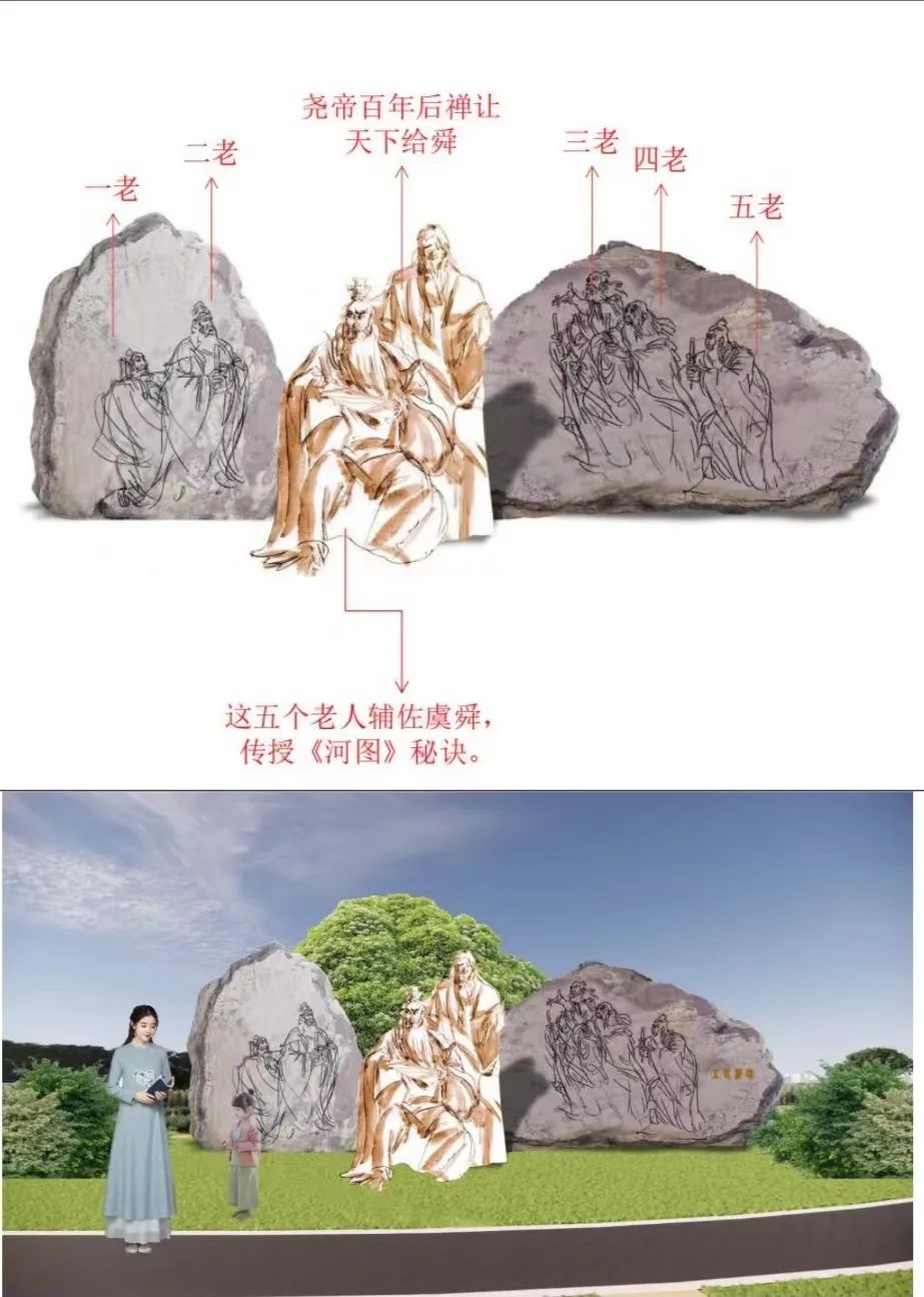 古代帝王授命于天,替天行道,故稱天子。于是,歷代帝王及其王權(quán)都希望得到上天之認(rèn)可,這便是祥瑞出世,順天應(yīng)命。堯通過考察,覺得舜有擔(dān)當(dāng)、行德孝,欲讓天下給他,但不知天意如何。偶逢九月九日,便率領(lǐng)舜等大臣登上首陽(yáng)山,觀察大河及河西之洛河、涇河。這時(shí),有五個(gè)老人也在游河渚,乃是二十八宿的精靈昴日雞。其中一老告訴堯舜說(shuō):“河圖將來(lái)告帝期。”二老曰:“河圖將來(lái)告帝謀。”三老曰:“河圖將來(lái)告帝書。”四老曰:“河圖將來(lái)告帝圖。”五老曰:“河圖將來(lái)告帝符。”然后化為流星,飛升上入昴宿。不久,有兩條紅胡子龍負(fù)圖而出,堯與舜共同觀看,上邊寫道:“帝當(dāng)樞百則禪虞。”說(shuō)堯帝百年后禪讓給舜。帝堯便感嘆道:“天之歷數(shù)在爾躬!”原來(lái),上天的歷數(shù)落在你的身上!于是,便把天下禪讓給了舜。這五個(gè)老人為了教導(dǎo)輔佐虞舜,傳授《河圖》秘訣,便落戶在了永濟(jì)的虞鄉(xiāng),就是五老峰?!渡胶=?jīng)》即根據(jù)五老《河圖》演繹而成,沒有五老峰,便沒有《河圖》。