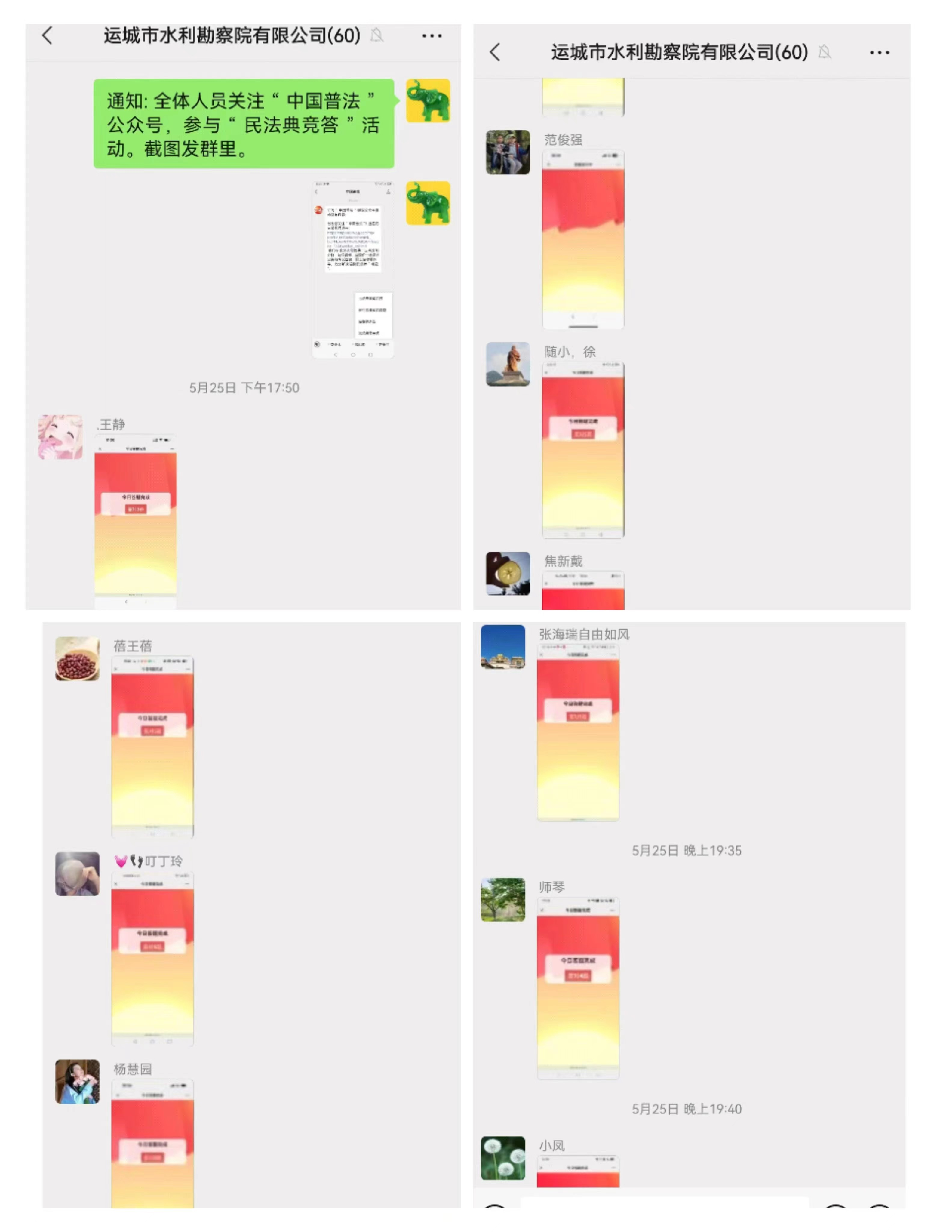 5月25日以來,公司組織全體干部職工開展“美好生活·民法典相伴”主題宣傳線上每日答題活動,活動主題思想以深入學(xué)習(xí)民法典,大力弘揚(yáng)社會主義核心價(jià)值觀,大力弘揚(yáng)社會主義法治精神。大家積極線上自主自學(xué),全體干部職工了解熟悉民法典一系列規(guī)定,增強(qiáng)自覺學(xué)習(xí)民法典的意識,不斷樹立遵法、知法、學(xué)法、懂法、守法意識,在民法典宣傳引導(dǎo)中弘揚(yáng)法治精神、匯聚法治力量、提升法治水平。